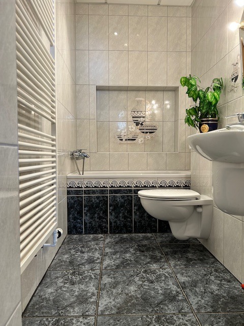Die Gewerbeetage verfügt über zwei Eingänge, einen Terrassen- und einen Treppenhausausgang und eine Veranda. Die Brennwerttherme (smartfähig) für diese Etage wurde im Jahr 2023 neu gebaut und befindet sich im Keller). Die Elektroanlagen (im Erdgeschoss und im Haus wurden 2022 erneuert). Die Eingänge sind beheizt und für die Fußböden wurde Granit verwendet (Abrieb- und Rollstuhlgeeigneter hochwertiger Belag). Es wurde einbruchsicheres Glas verwendet.